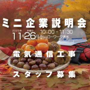 ハローワーク清水主催 ミニ企業説明会参加のお知らせ この度、弊社はハローワーク清水が主催するミニ企業説明会にエントリーいたしました。本説明会はハローワーク清水が主催する地域密着型の企業説明会で地域のインフラを支える私たち […]